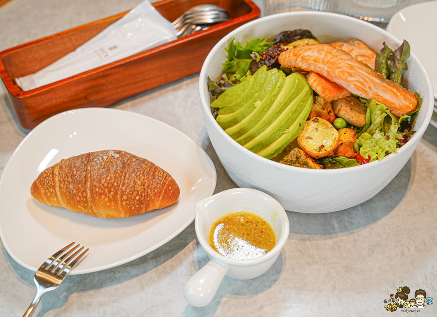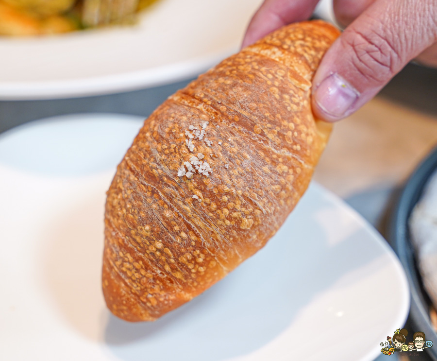 溫沙拉還有搭配一顆鹽可頌,外面酥脆帶有軟綿口感,越咀嚼越好香