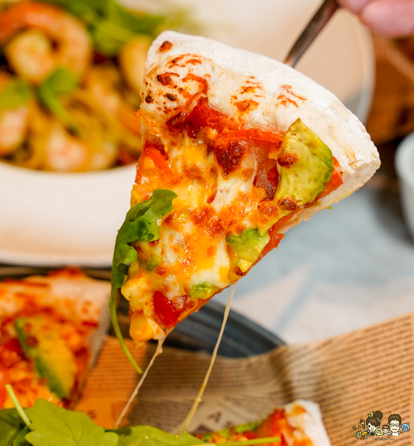 這裡也有提供披薩可以點,推薦這款有九層塔香的綠意田園蕃茄酪梨比薩