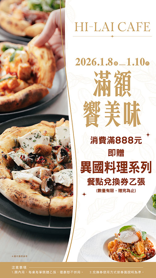 消費滿888元即贈「異國料理」系列餐點兌換券 乙張(限量1000份,贈完為止)