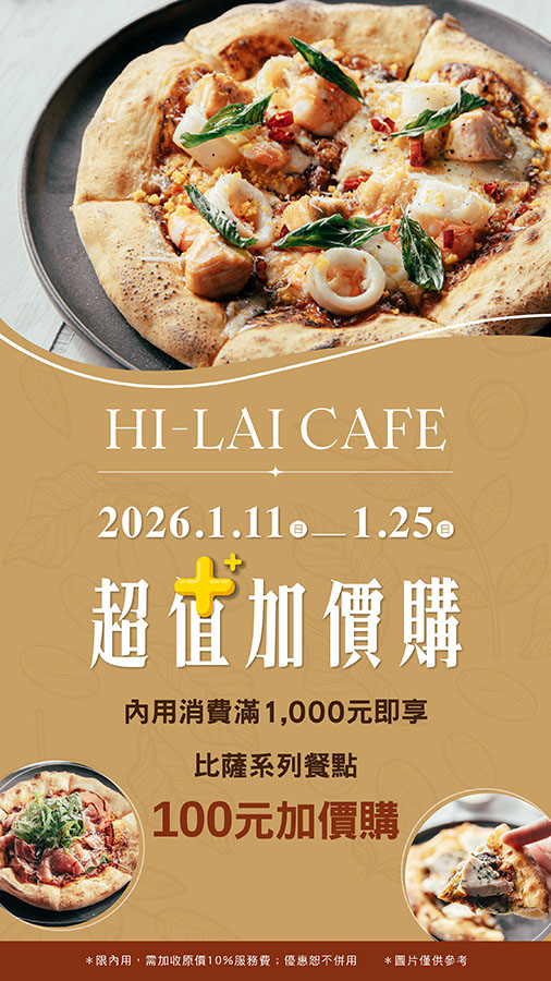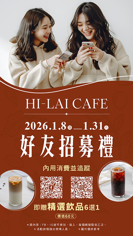 內用消費並追蹤「HI-LAI CAFE」FB or IG,即贈精選飲品6選1(價值60元)