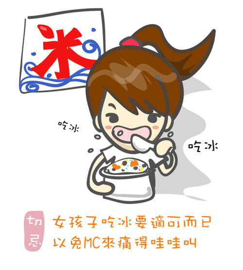 導致MC來哇哇叫>< 尼力身體不好 因為婦女病很多 常常因為MC困擾我很久 看過中醫、西醫通通沒什麼效果 連自己愛喝的綠茶都要戒掉(綠茶是寒性低、建議女生可以多喝紅茶) 女生要多愛自己 身邊的男生也要多體貼女生 MC來發飆是正常低 我還有痛到想要自殺… 醫生說是體質關係 調了一陣子中醫有效 後來突然又沒效果 痛到臉色發白,窩在地上不起 嚇壞了朋友><.. 應該要趁年輕就要學乖 冰品盡量少碰 瞭解自己的身體結構 才能對症下藥 今天老闆害我 因為他買冰來引誘我…. 如果這個月我MC又發作 那我就只好說SORRY了~ 老娘今天不幹了(因為要請假回家休息..)