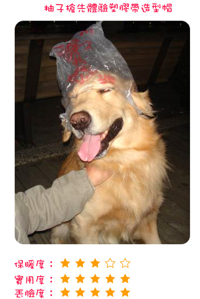 沒關係~叫你媽咪也去戴"塑膠袋"帽子去馬路上轉一圈@@"
