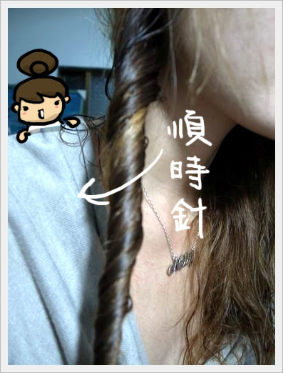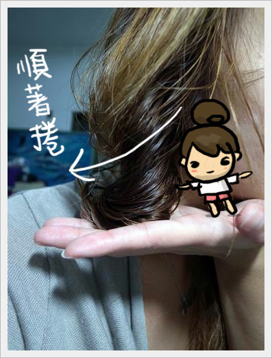 將頭髮用巧妙的手捲起來~就像上圖一樣(往內捲)