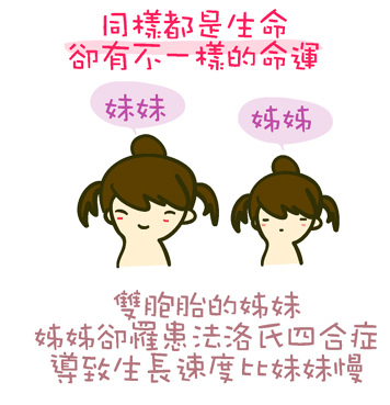 她是雙胞胎其中一員,生為姊姊,卻因為罹患”法洛士法洛氏四合症”,