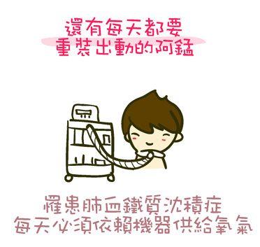 他罹患罕病原發性肺血鐵質沉積症,必須要靠機器,拉著長長的管子,供給氧氣