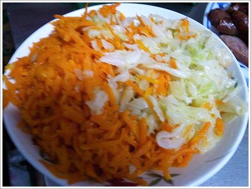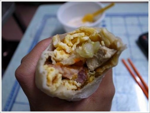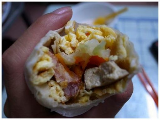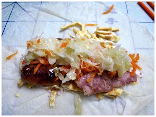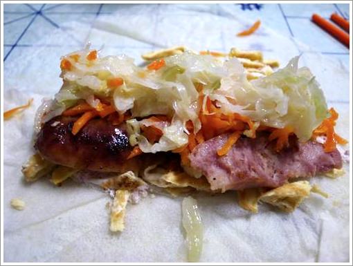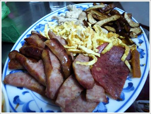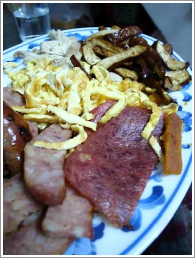 一定會有香腸、水煮豬肉、煎蛋、豆乾、蘿蔔絲、高麗菜