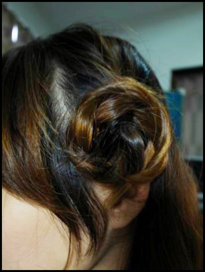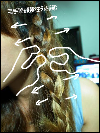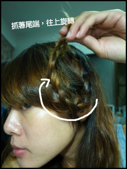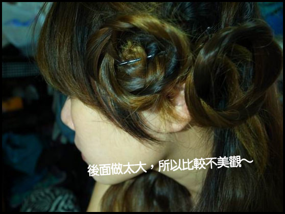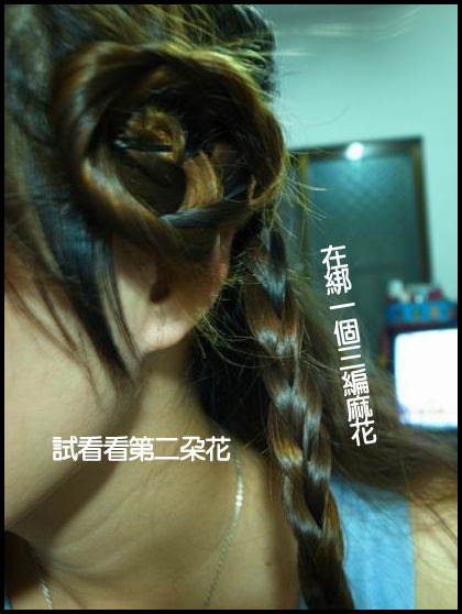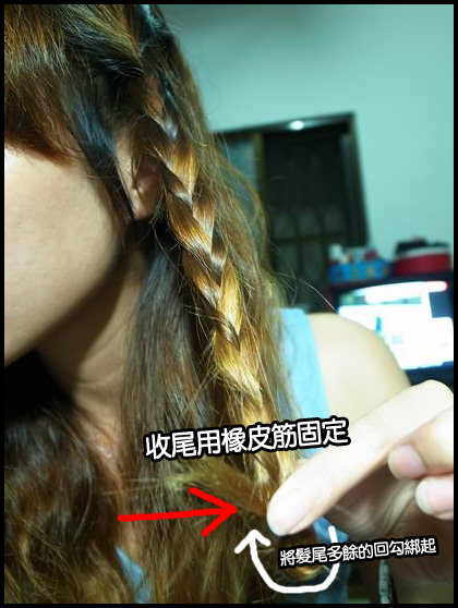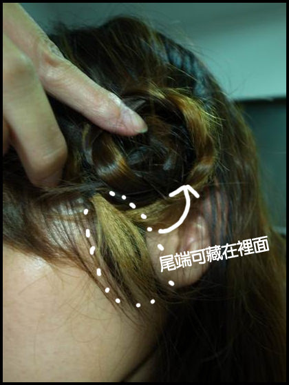 編玩後~把髮尾的部份往上對折用黑色橡皮筋綁好