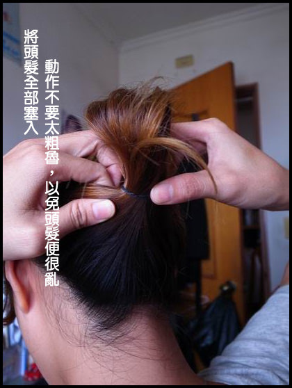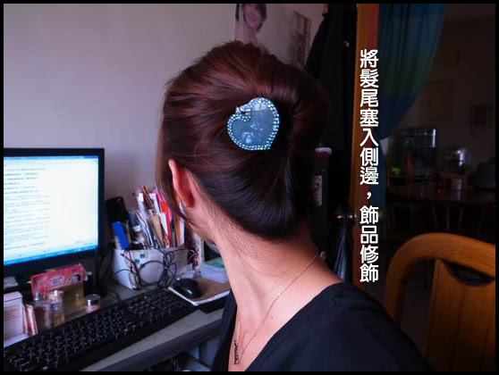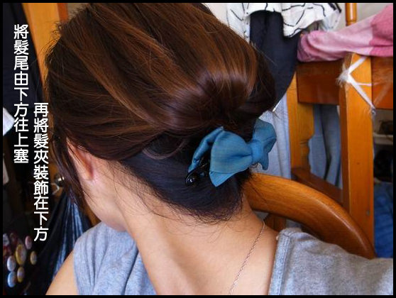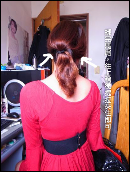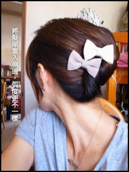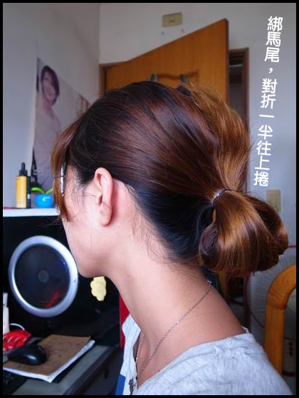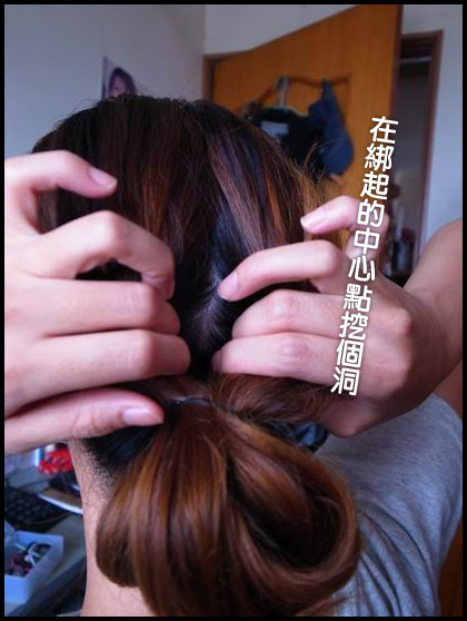 步驟:綁馬尾半折,在固定處上方開個洞,將頭髮塞入即可