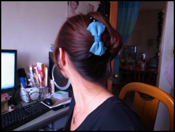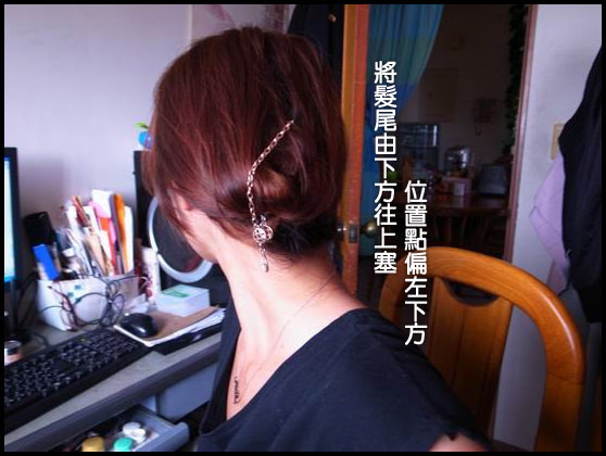 髮尾固定在頭的中心點,主要開洞的位置在左邊