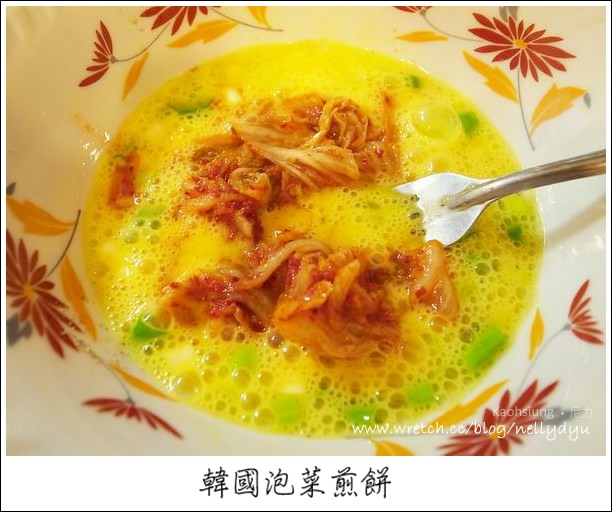 不囉嗦,先把蛋跟蔥花、泡菜一起打均勻