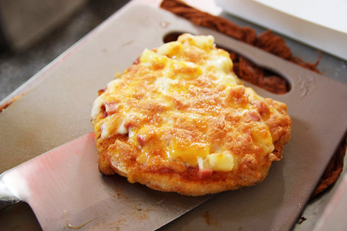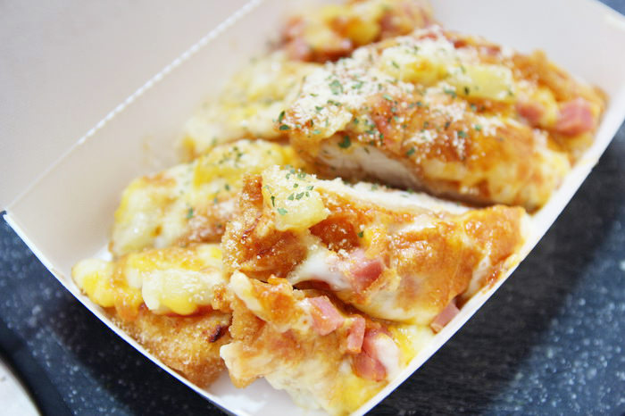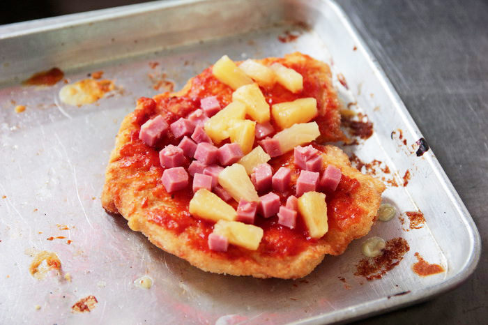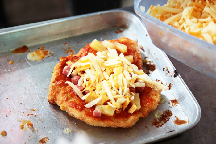 炸好的脆皮雞排抹上披薩醬料,披上鳳梨、火腿等配料