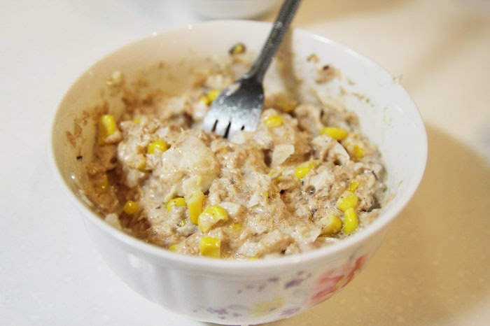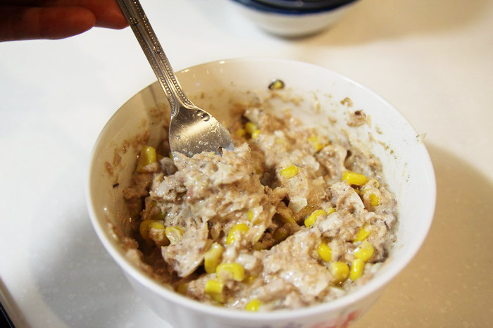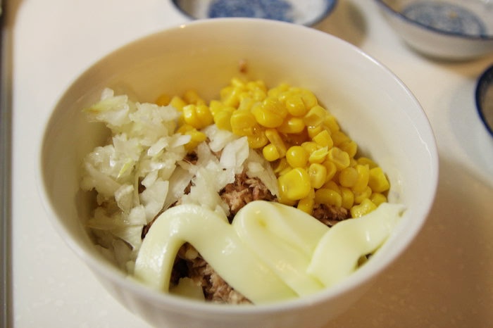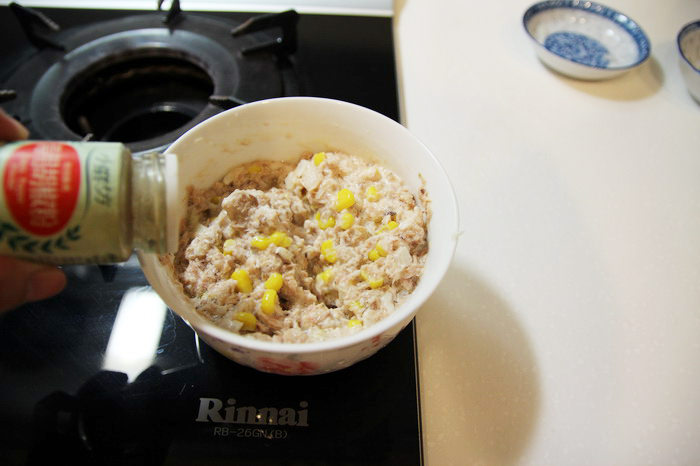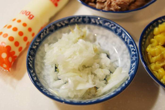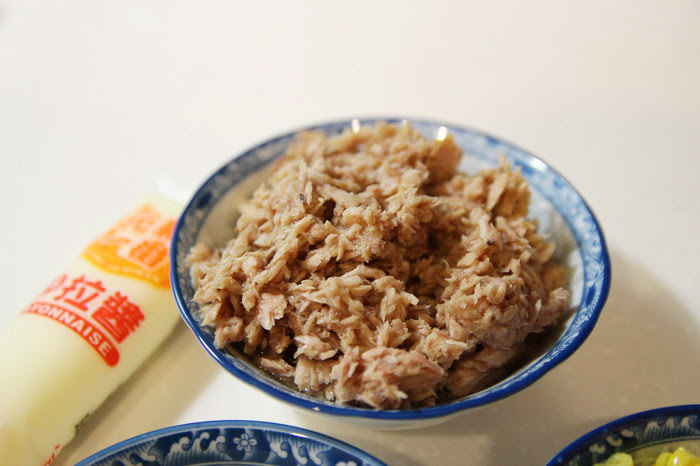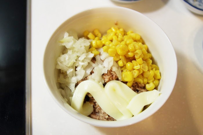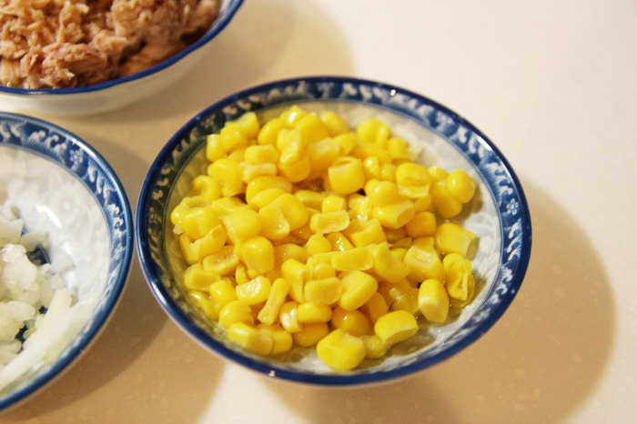 食材:水煮鮪魚罐頭、玉米罐頭、洋蔥末、沙拉(美乃滋)