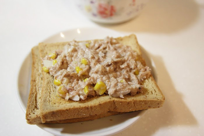 烤了兩片全麥土司~~把鮪魚玉米洋蔥沙拉滿滿的撲上去!!