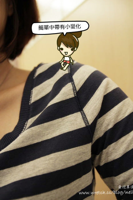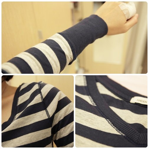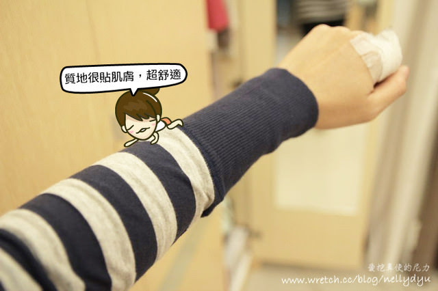 質地很柔軟,貼近肌膚不卡卡,雖然是一般的橫條長版T,袖子多了一點變化,就會大大的不同