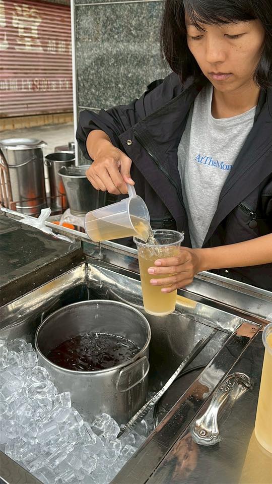 綜合茶的顏色看起來有點像梅子綠茶,上面還有漂浮1~2顆梅子,阿嬤有時也會從桶子內舀出梅子請大家吃
