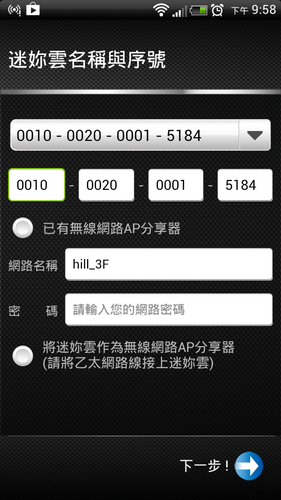 一開始需要稍微的等候一下,迷妳雲會去搜尋網路。偵測到名稱序號,在繼續往後步驟