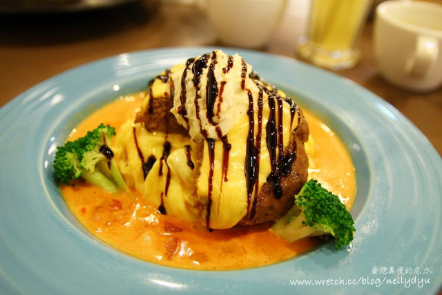 鮮奶油綿密使牛肉堡更滑口,增添風味,上面還有些微咖啡色的醬料