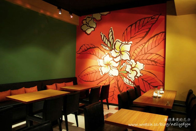 紅色牆面有雞蛋花的彩繪,餐廳內的色彩大多屬於熱帶氣息,桌椅比較普遍簡陋