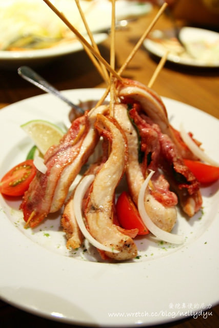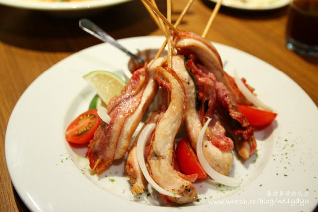 雞肉加上培根,擺盤也是很特別,一端上來有驚呼一下,還有些許番茄、洋蔥、檸檬跟特製沾醬