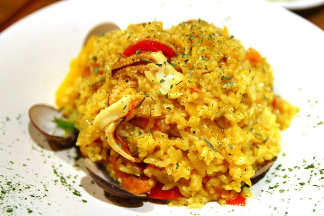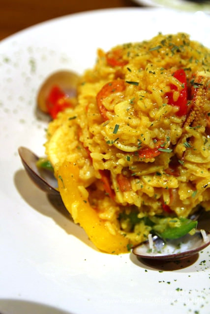 飯粒太軟嫩潮溼,西班牙海鮮燉飯居然有咖哩香氣,味道還蠻詭異的