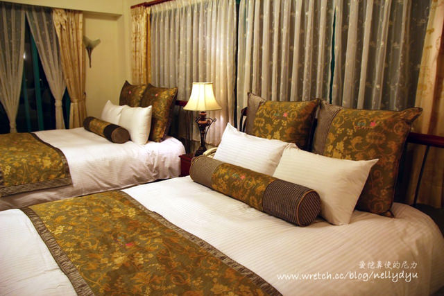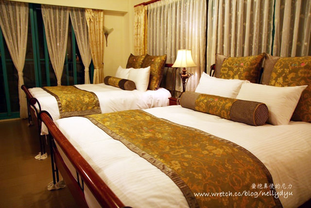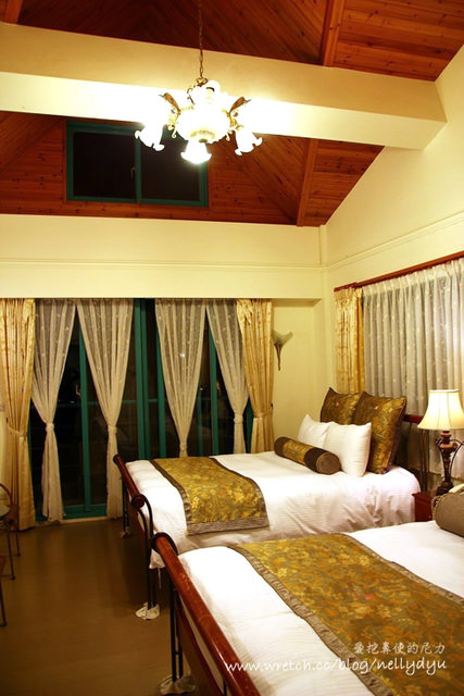 裡面有點像是小木屋的裝潢,帶一點金碧輝煌的窗簾、床鋪周邊,帶有高雅氣派的風格