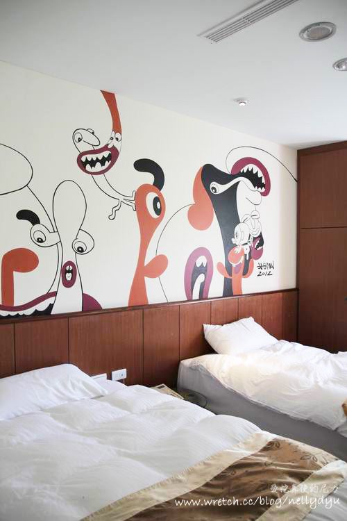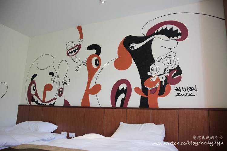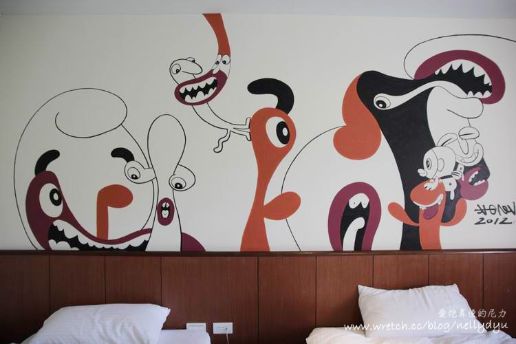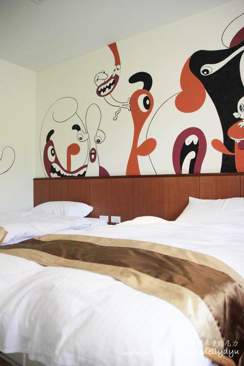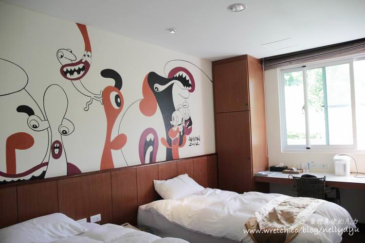離妖怪村、內湖國小、溪頭森林遊樂區、天梯都很方便,加上飯店很新穎帶有趣味妖怪塗鴉