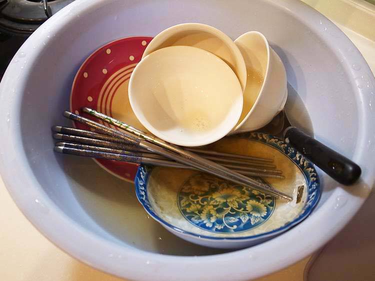 只要用盆子裝滿水,把吃過用過的油膩碗盤丟入水盆內浸泡