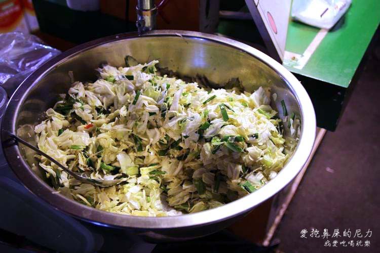 旁邊的大鐵盤是高麗菜、冬粉等餡料,都是店家獨家的作法