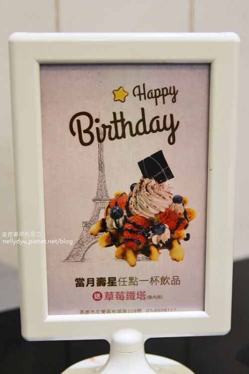 桌上的看板上寫,當月壽星任點一杯飲品,就送草莓鐵塔