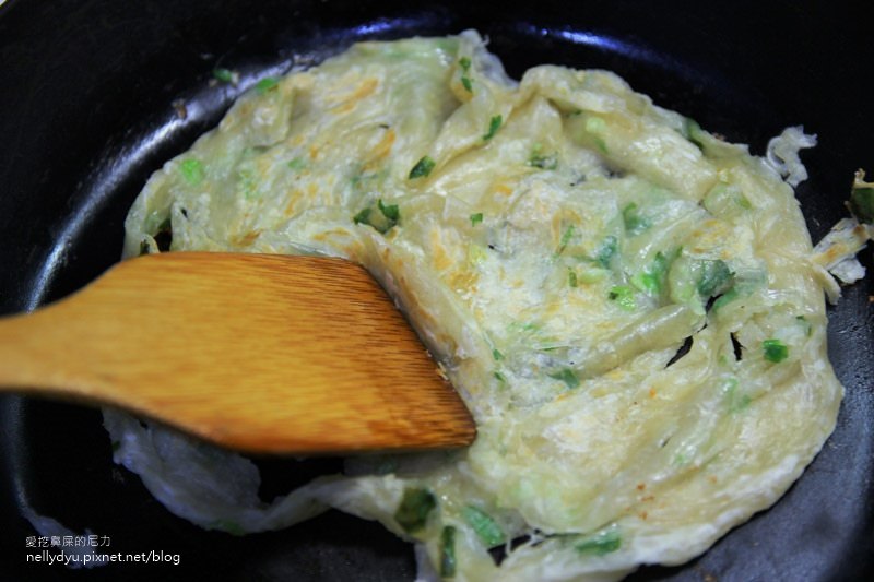 一邊油煎可以稍微用鏟子讓蔥油餅有空氣感,稍微的搓壓一下