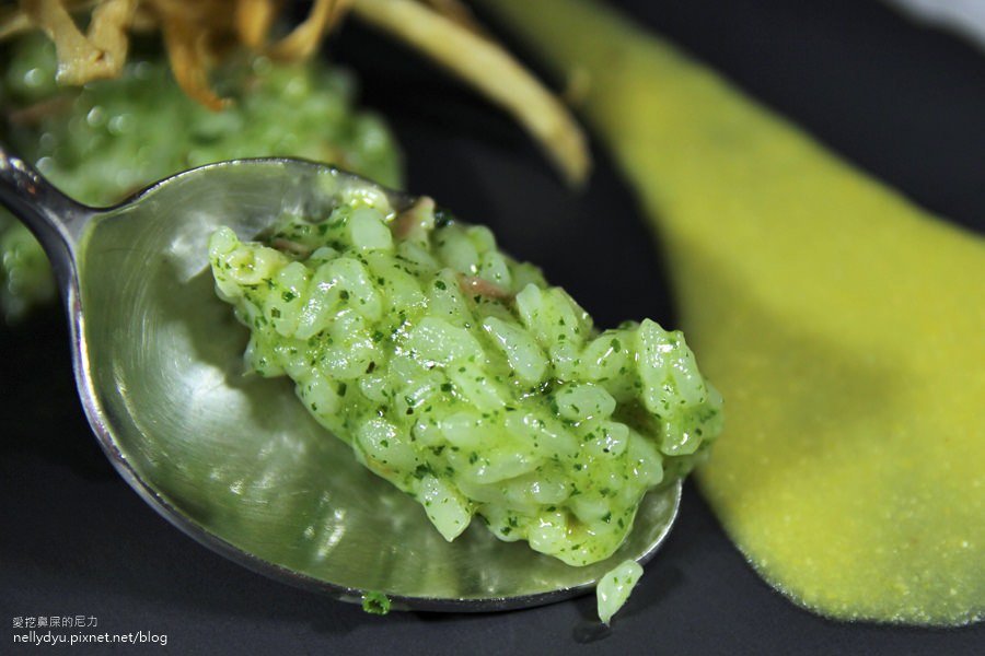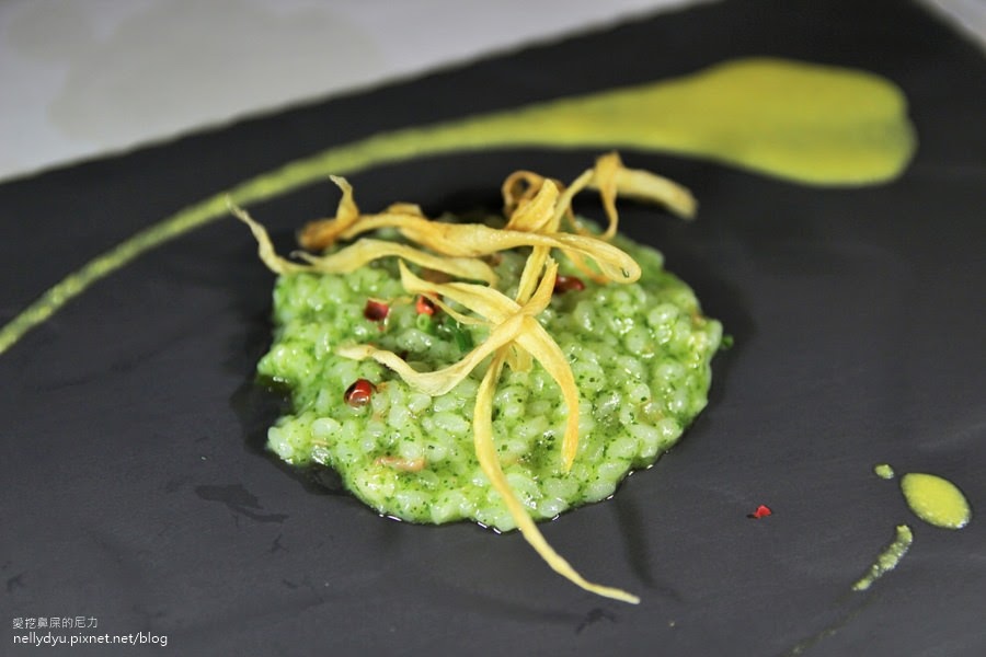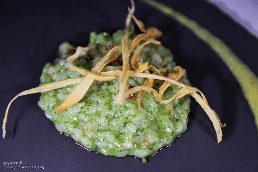 上面搭配了牛蒡絲、胡椒顆粒,帶有大自然草綠的香草燉飯