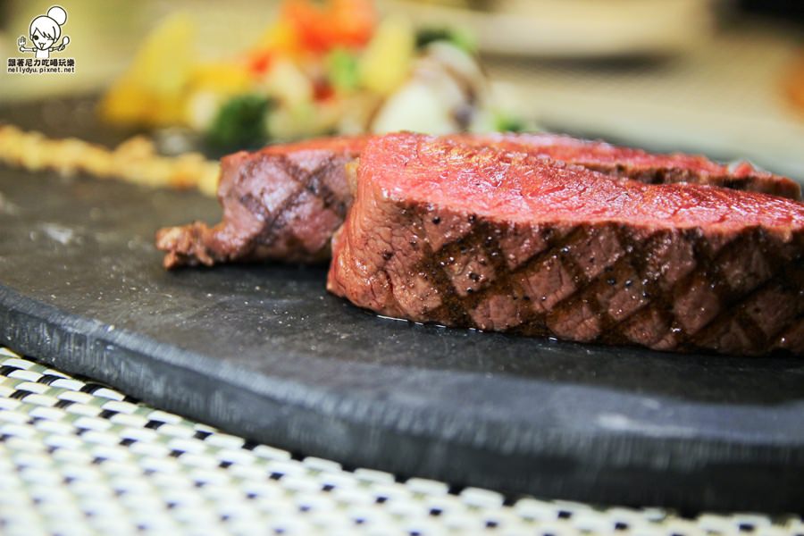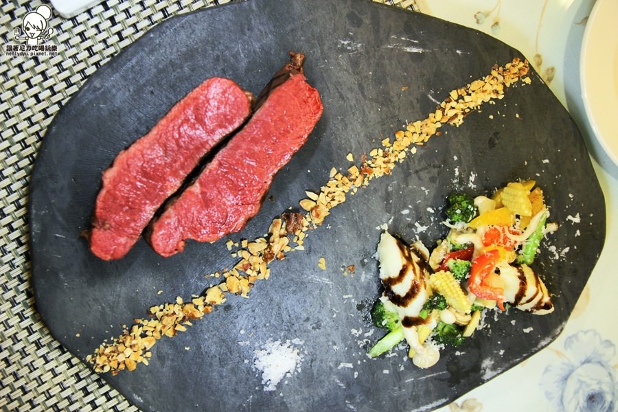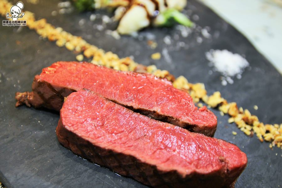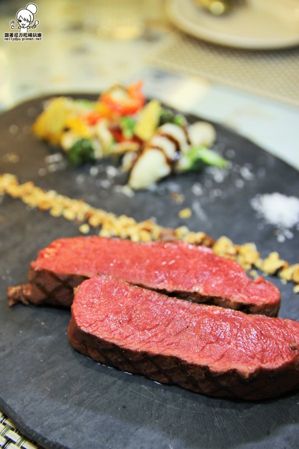 低溫36H安格斯黑牛板腱佐醇酒醬汁,牛肉則是五分熟