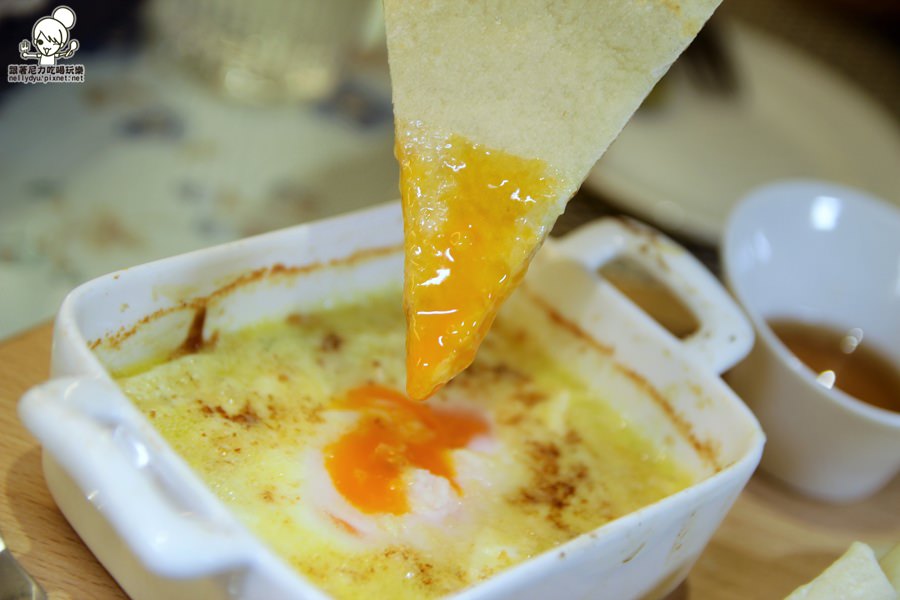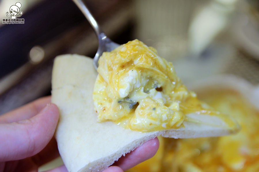 使用四種起士搭配,裡面還有一顆半熟蛋,攪拌均勻就可以直接沾著餅吃