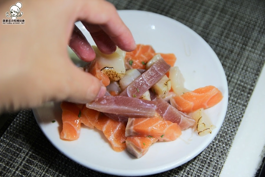 新鮮魚肉(鮭魚、鮪魚、干貝)家裡冰箱有的新鮮食材即可