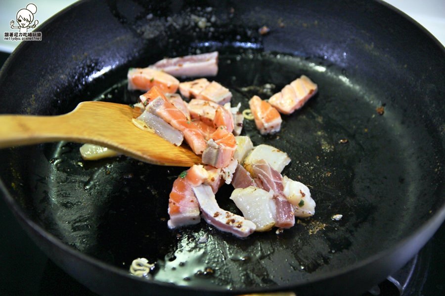 接著用泡麵內的調味油包炒魚肉,讓魚肉的味道更上一層