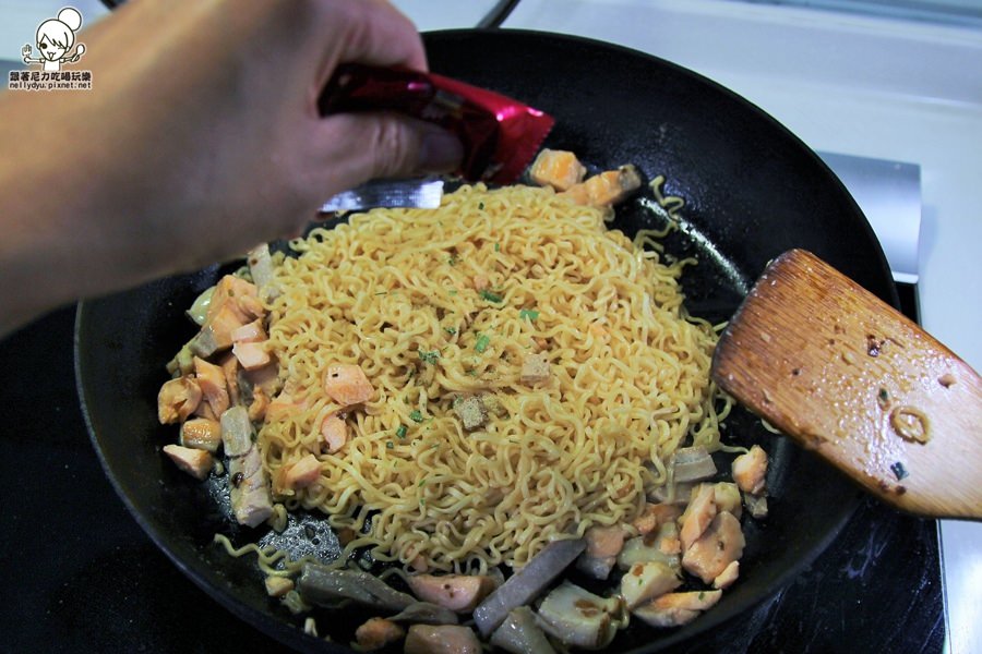 最後把泡麵、調味粉包通通倒入一起拌炒