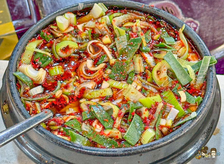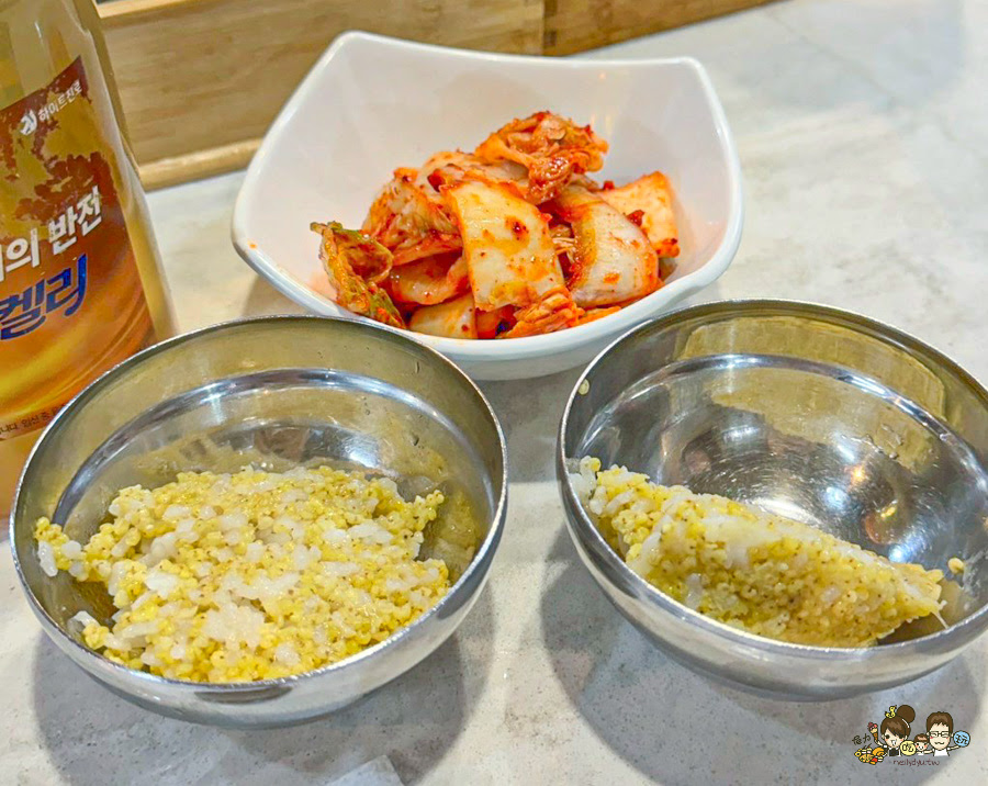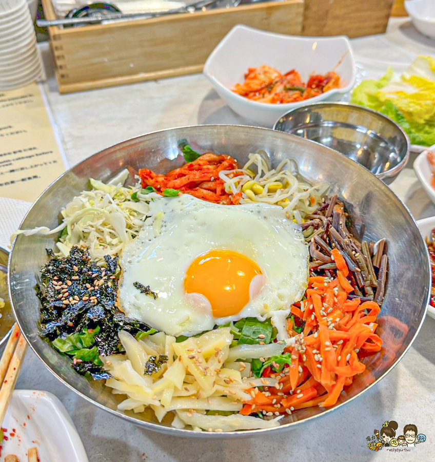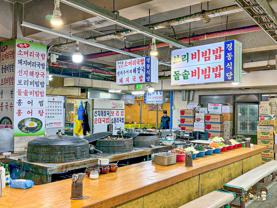 旁邊的石鍋拌飯專賣店,大鍋子看起來也好威、還有超多小菜在吧檯上