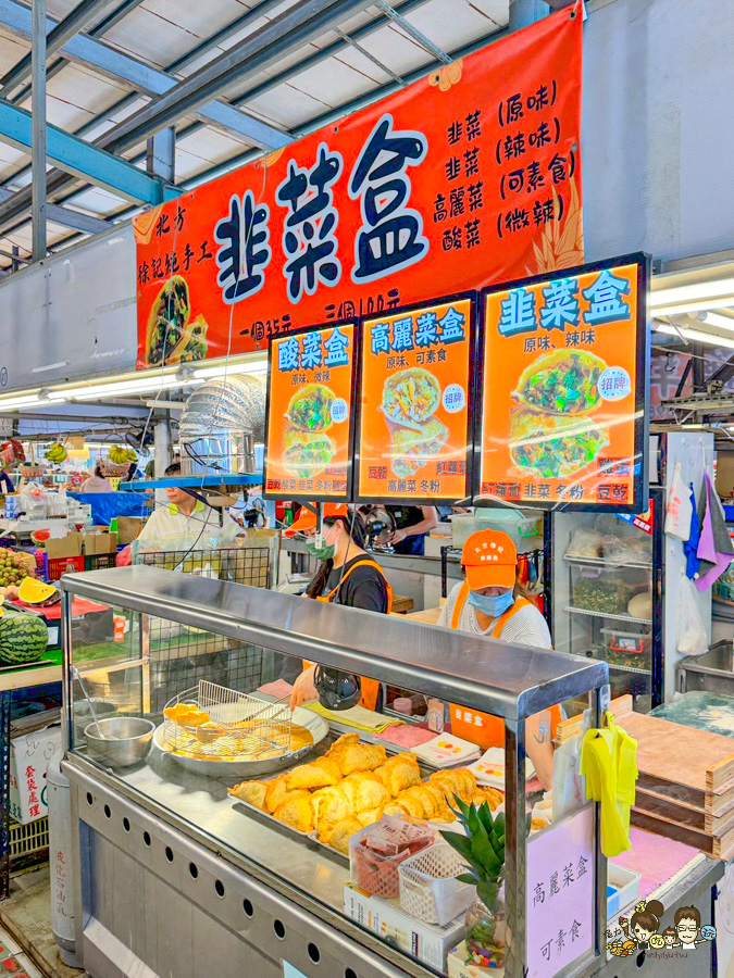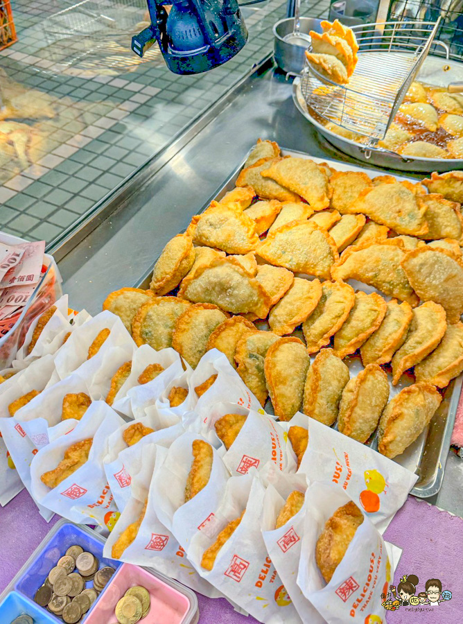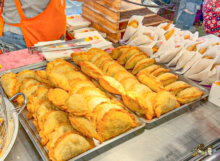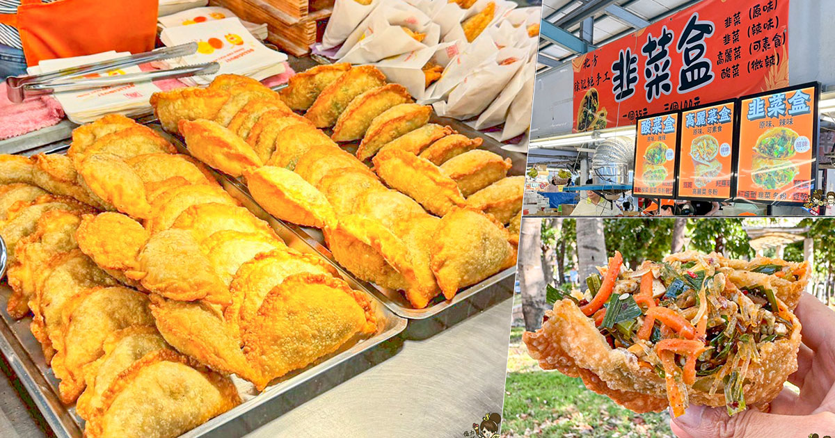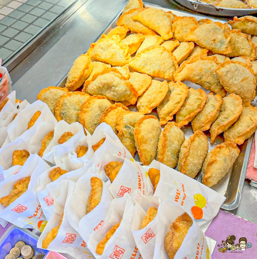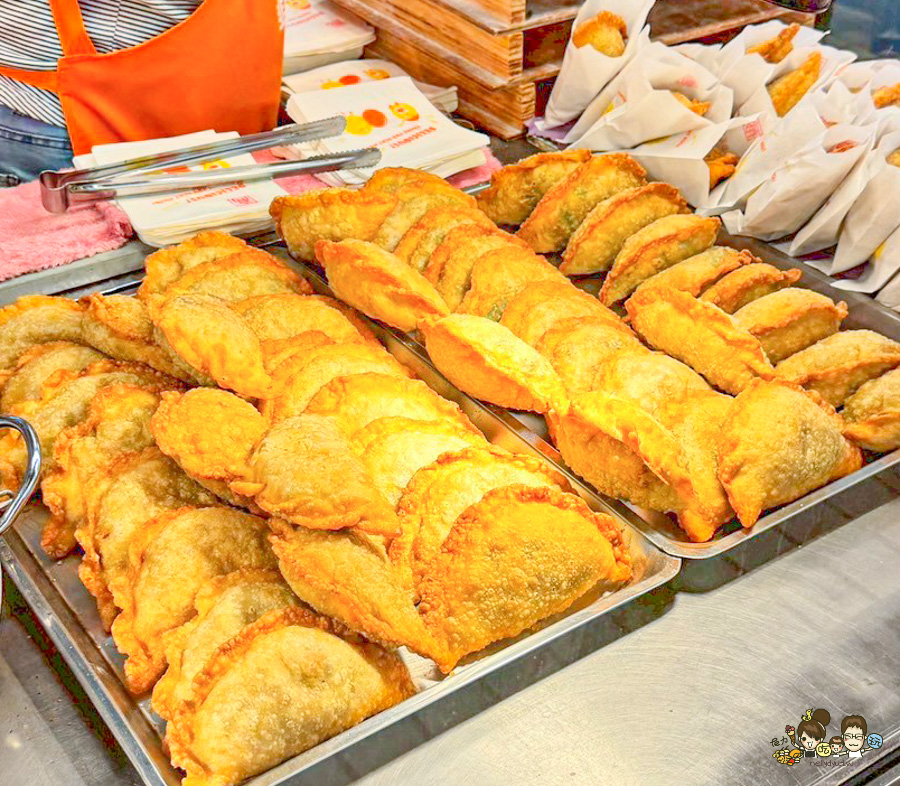 檯面上買買的韭菜盒大平台,靠近看才知道有三種口味、還有一款辣的韭菜盒