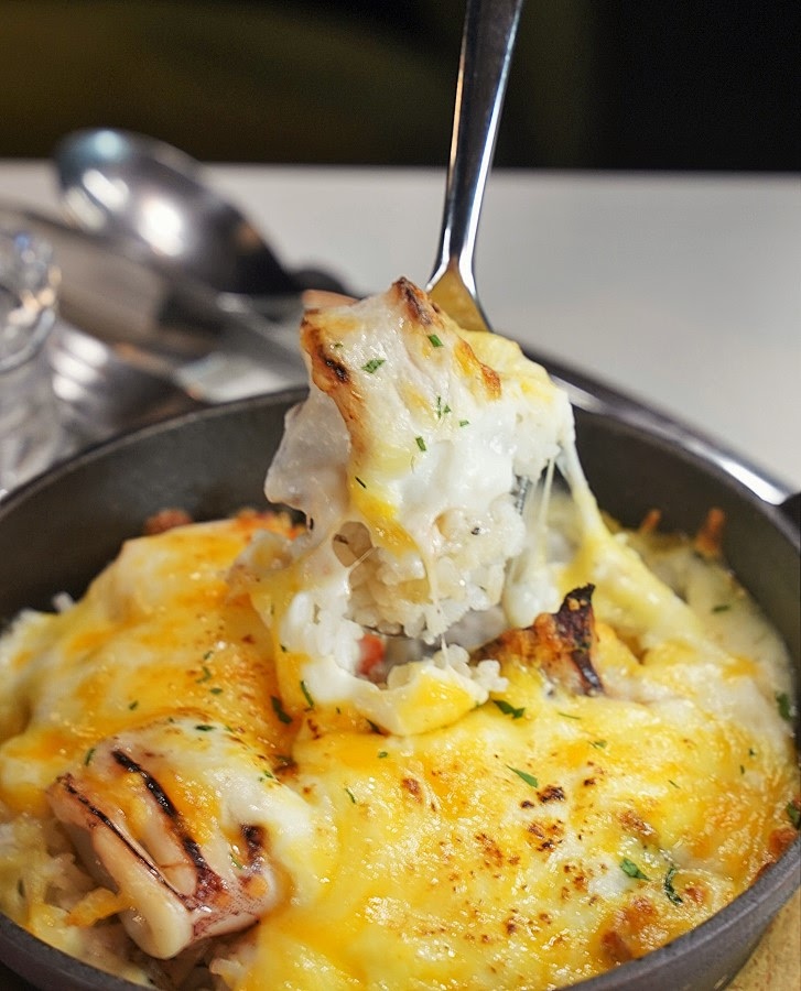 焗烤控必吃 貝夏美醬海鮮焗烤飯,主廚使用白醬、搭配起司焗烤