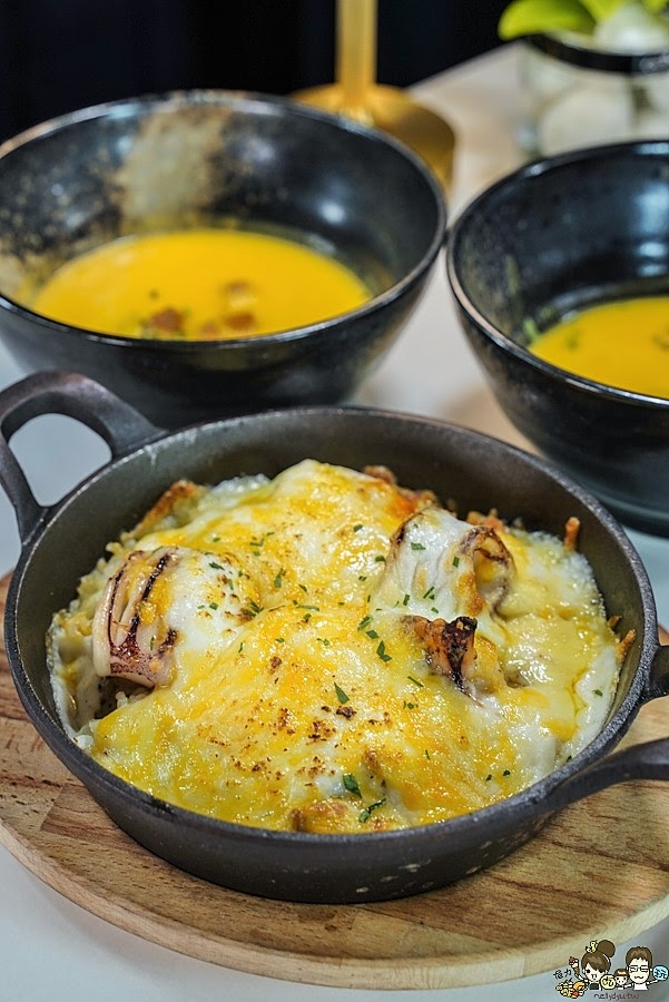 選用澎湖海釣中卷、肥美蝦子,讓白醬焗烤不膩保有海鮮的鮮度