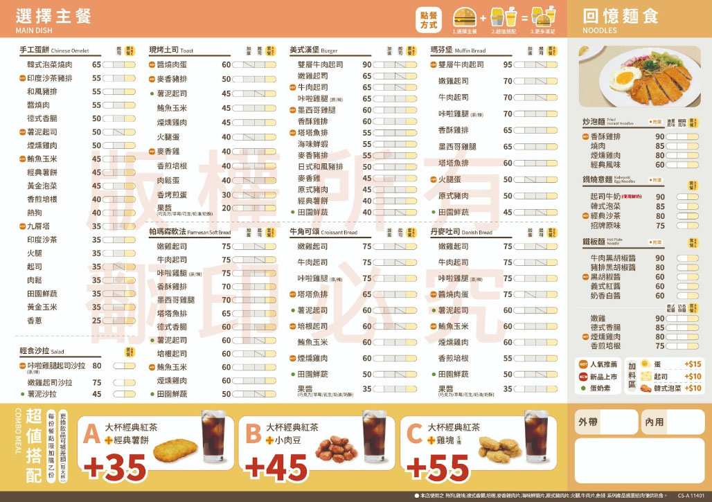 餐點樣式很多,正反面都有,還有超值搭配有小點心+飲料
