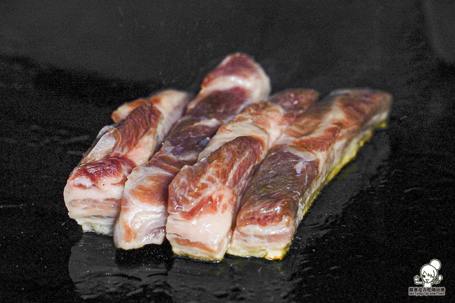 乾式熟成大麥豬五花會先於鐵板上油煎,逼出油脂滋潤肉質
