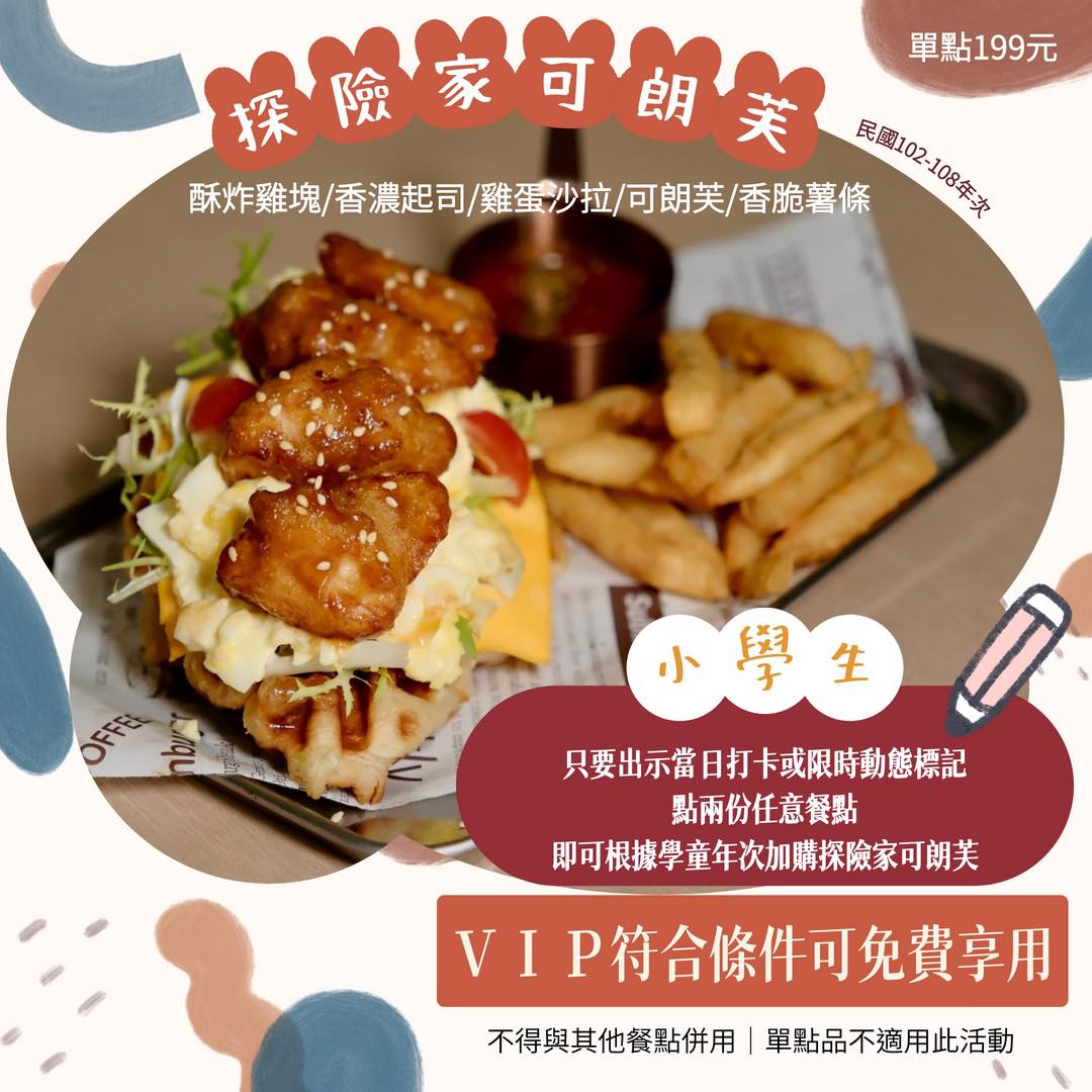 帶著國小學童來用餐,點任意兩份餐點,即可享有免費探險家可朗芙(原價199元)
