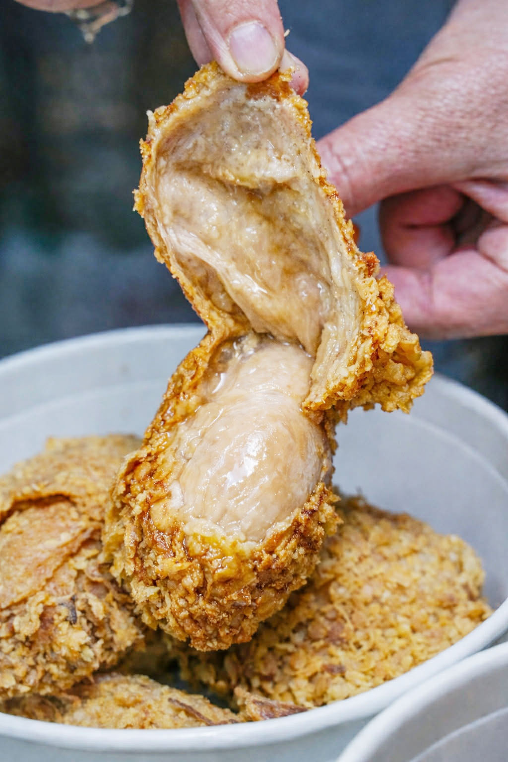 這裡炸雞每一塊都會純手工順過表面的皮再下去油炸
