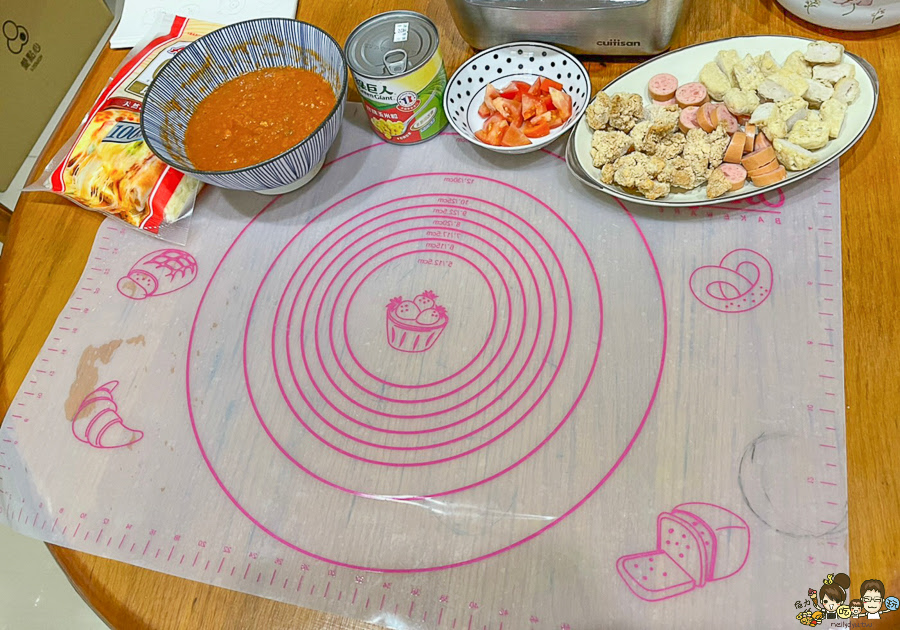 便利商店買了熱狗回來切片,雞塊、鹹酥雞剪開即可當配料,披薩醬是沒用完的義大利麵肉醬當披薩醬
