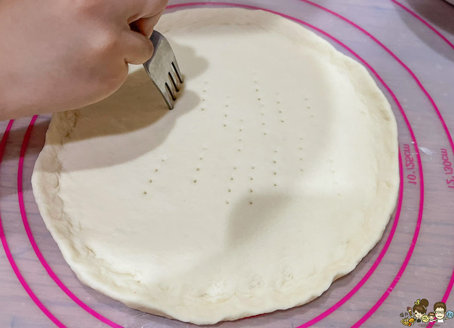 使用小叉子,在披薩皮上面搓動,烤的時候比較容易熟、也會帶一點酥脆度