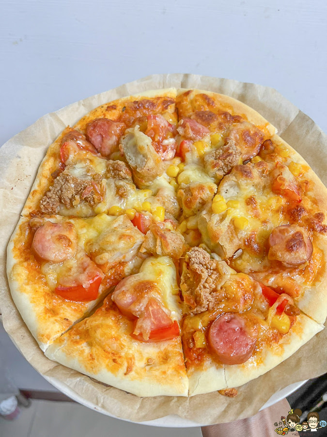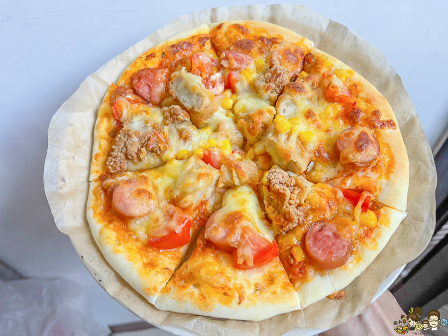 披薩口感咀嚼起來帶一點扎實Q度,邊緣帶一點酥脆、餡料也相當好吃