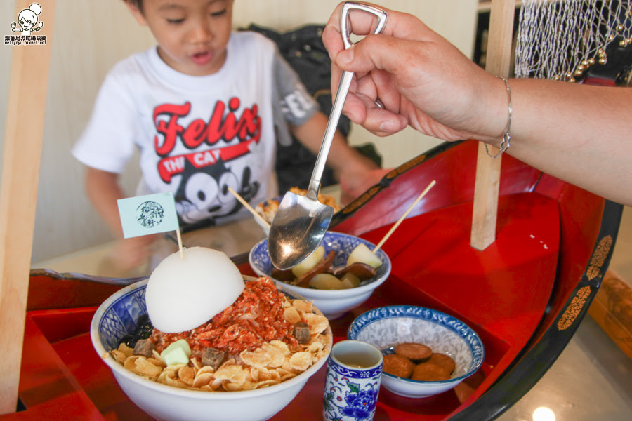 使用貴三三的油魚子,搭配特製糖炒櫻花蝦、鮪魚糖,帶出東港特色的創意冰品