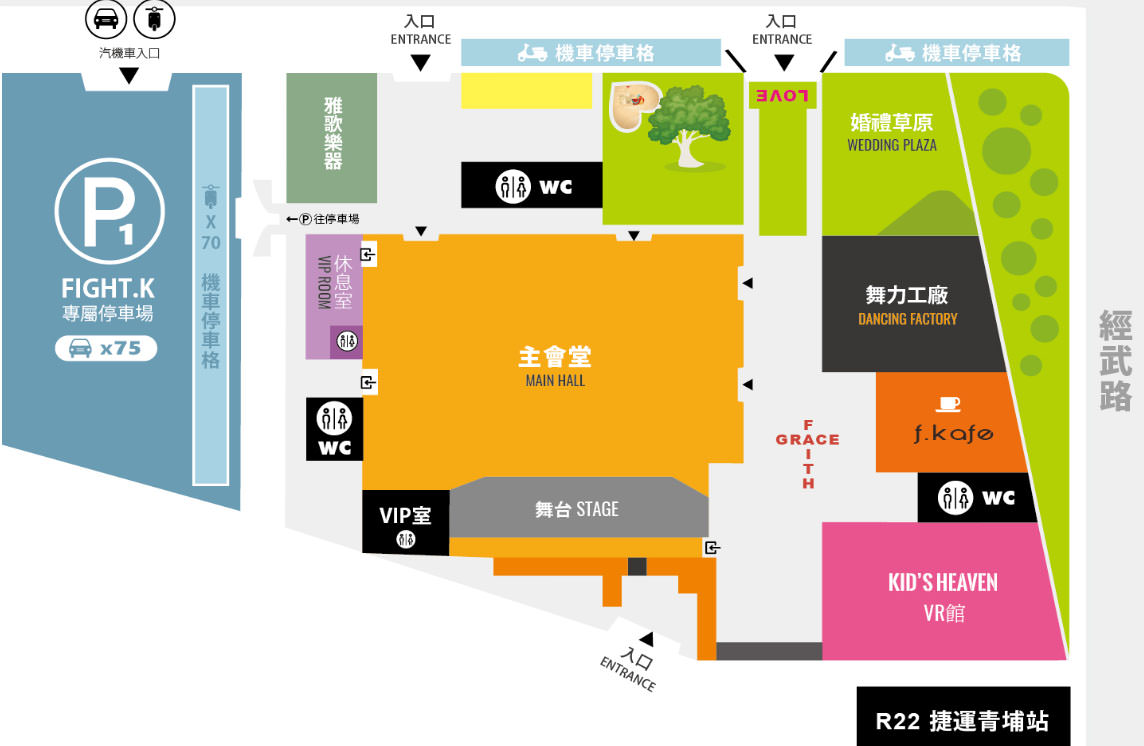 裡面有舞台、教會、VR館、舞力工廠、婚禮草原?!