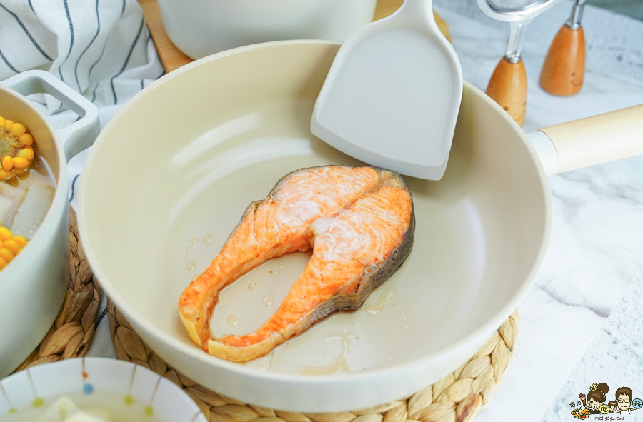 加上鮭魚本身有豐富油脂,只要一點點油就可以完成
